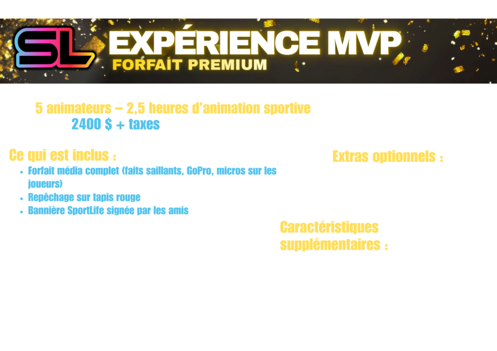 Chaque forfait comprend : un événement sportif animé clé en main, tout l’équipement sportif (soccer, basketball, hockey, football, baseball et plus encore), des haut-parleurs de DJ avec musique, ainsi qu’une ambiance de jour de match complète avec lasers, projecteurs et effets de fumée. De plus, notre forfait photo et moments forts permet de capturer chaque instant inoubliable.