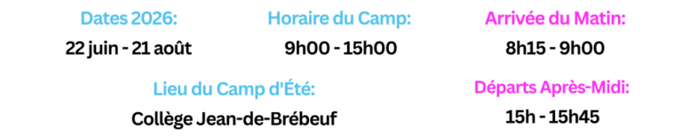 À Noter: Les heures prolongées sont uniquement disponibles pour les camps qui se déroulent au Collège Jean-de-Brébeuf.