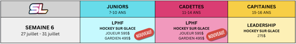Les campeurs auront la chance d'essayer tous les sports d'équipe que nous offrons à SportLife, avec bien sûr, nos touches professionnelles qui leur donneront l'impression d'être de véritables champions de la LNH, de la MLB, de la NFL, de la FIFA et de la NBA, TOUT CELA EN 1 SEMAINE !